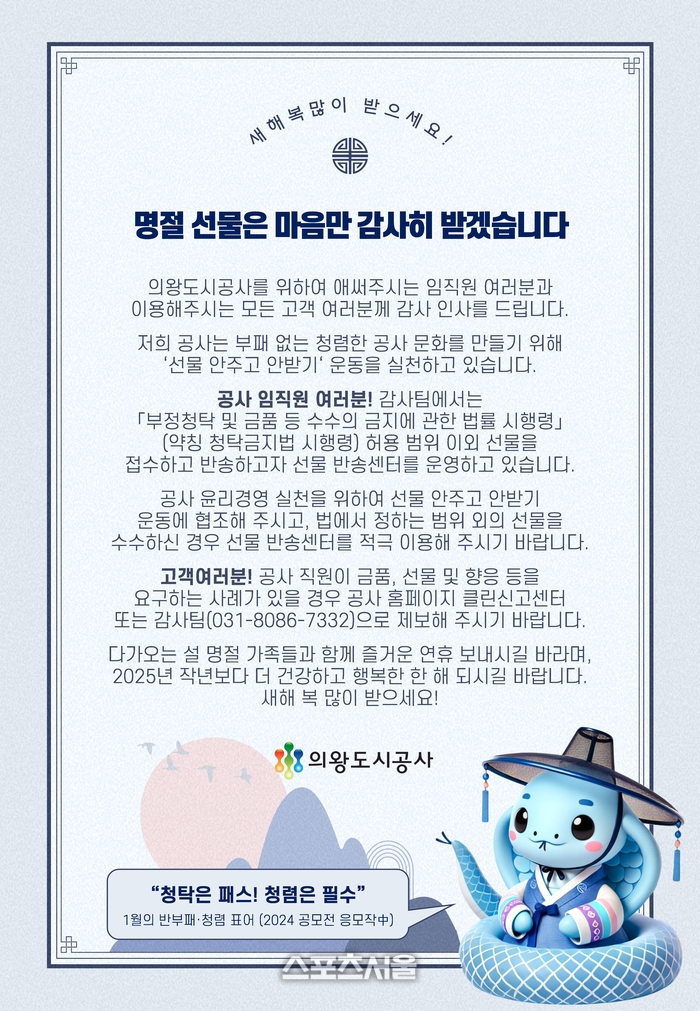 〔스포츠서울│의왕=좌승훈기자〕의왕도시공사는 설 명절을 맞아 다음 달 9일까지 ‘선물 안주고 안받기 운동’을 진행 한다고 16일 밝혔다.