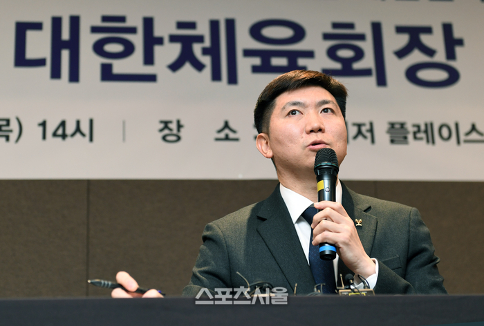 제42대 대한체육회장에 당선된 유승민 전 IOC위원이 16일 서울 중구 프레이저 플레이스 호텔에서 진행된 당선 기자회견에서 취재진의 질문에 답을 하고 있다.