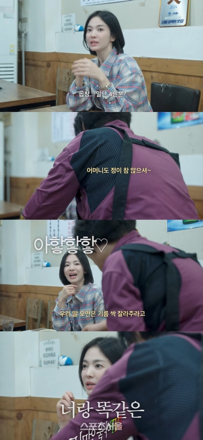 공개된 영상에서 강민경과 함께 단골 곱창집을 찾은 송혜교는 “많이 먹으면 한 달에 세 번 먹을 때도 있다. 지난 달에도 엄마랑 두번 왔다”며 곱창 사랑을 고백했다.