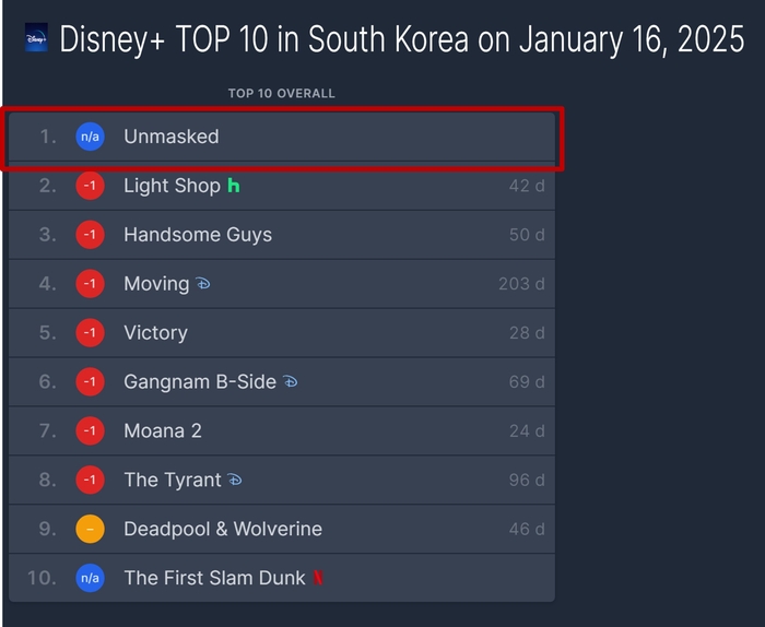또한, 국내 OTT 검색 및 추천 플랫폼 키노라이츠에서 수많은 영화, 시리즈를 제치고 1/16(목) 기준 ‘오늘의 디즈니+ 랭킹’ 1위를 기록하며 심상치 않은 반응을 얻고 있다.