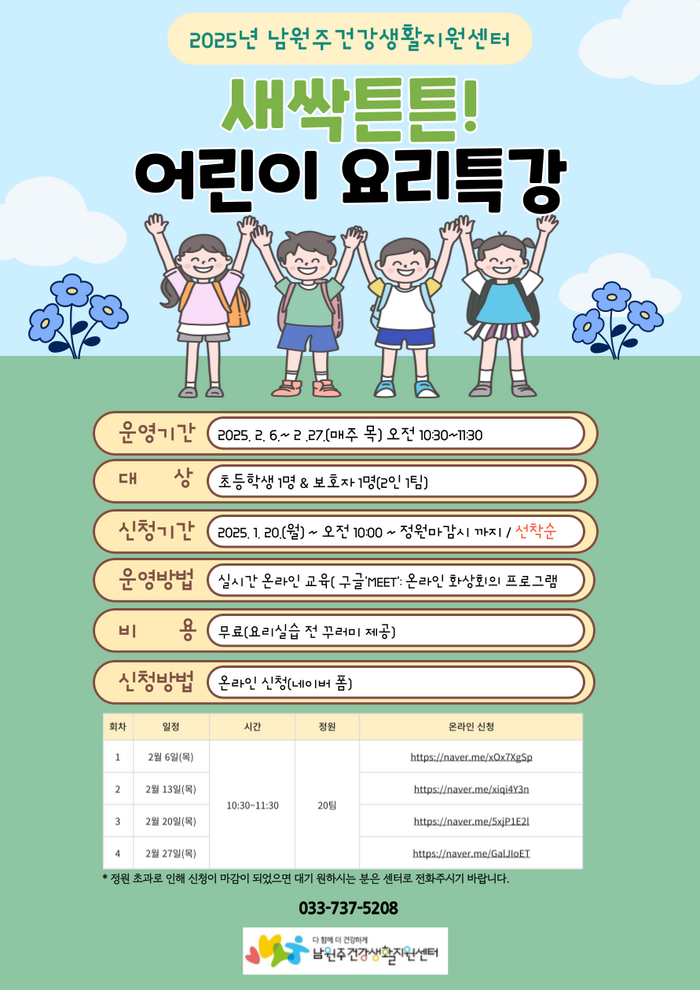 [스포츠서울ㅣ원주=김기원기자]남원주 건강생활지원센터는 겨울방학을 맞이해 초등학생의 건강한 식습관 형성을 위한 ‘새싹 튼튼! 어린이 요리특강’ 프로그램을 운영한다.