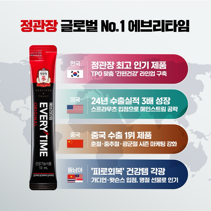 KGC인삼공사 관계자는 “‘에브리타임’은 글로벌 K-Health 브랜드로 자리매김하고 있으며, 앞으로도 현지 맞춤형 제품 개발과 유통망 확장을 통해 글로벌 시장에서 정관장의 위상을 강화하겠다”고 밝혔다.
