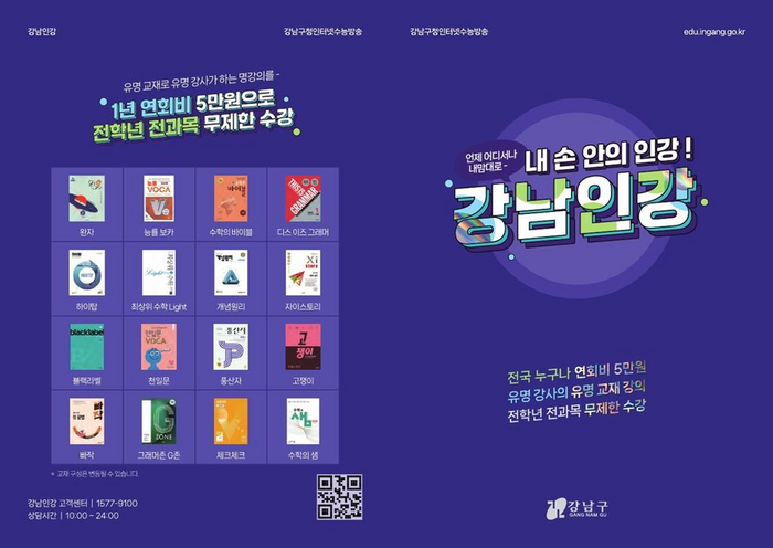 지원대상은 관내 중ㆍ고등학생 및 학교 밖 청소년으로 선착순 260명에게 연5만원 상당의 강남인강 수강권을 무료로 지급하고, 수강권을 받은 대상자들은 1년간 강남구청 인터넷수능방송(이하 강남인강)에서 제공하는 모든 강의를 무제한 이용할 수 있다.