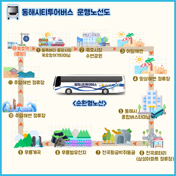 묵호역을 출발한 버스는 묵호항여객터미널, 수변공원, 어달해변, 망상해수욕장, 동해시종합버스터미널, 천곡로터리, 천곡황금박쥐동굴, 무릉별유천지, 무릉계곡, 추암해변, 감추사를 거쳐 묵호역에 도착하는 순환 버스로, 전체 소요 시간은 약 2시간이며 문화관광해설사가 탑승해 주요 관광지의 특징과 역사를 설명한다.