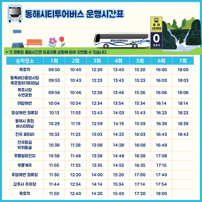 버스는 매주 토요일과 일요일, 공휴일에 운영하며, 2대 버스를 활용해 9:50, 10:40, 12:20, 13:40, 15:20, 16:00, 18:00 하루 7번 묵호역에서 출발한다.