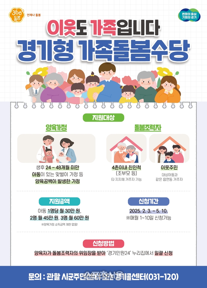 -2월 3일부터 ‘경기형 가족돌봄수당’ 지원사업 접수... 생후 24~48개월 미만 아동이 있는 양육공백 가정에 4촌이내 친인척(조부모 등), 사회적가족(이웃주민) 돌봄 조력자 수당 지원
