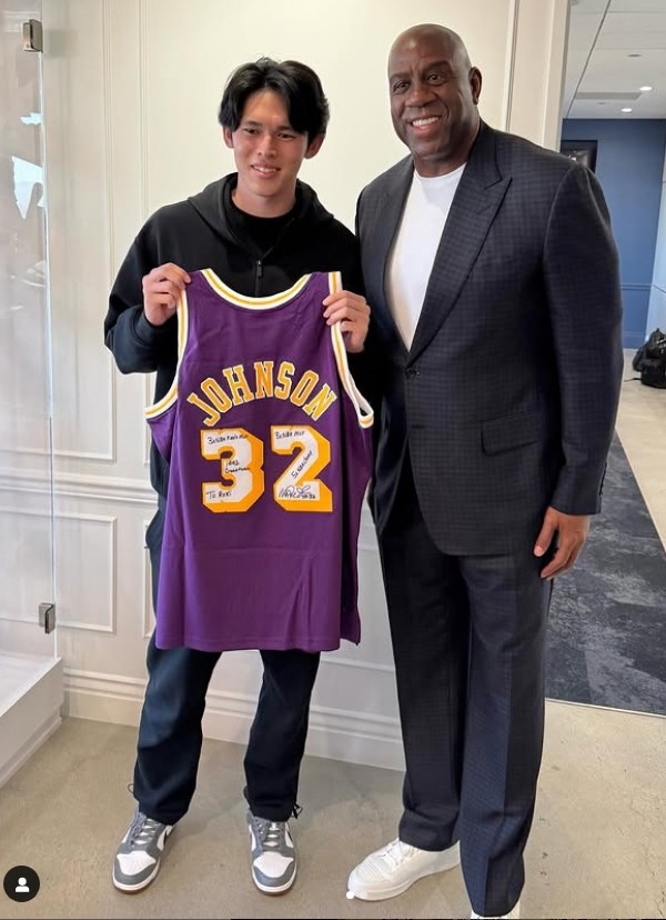 두 사람의 만남을 공개하는 사진을, 매직 존슨이 자신의 SNS에 올렸다. 사사키와 LA다저스와의 계약 소식이 전해진 18일이었다.