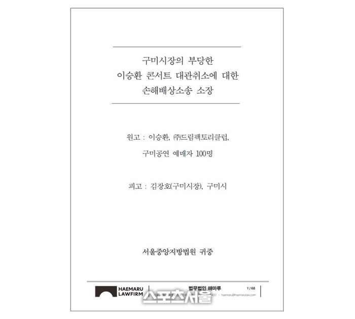 이승환 및 (주)드림팩토리클럽과 함께 구미 공연 예매자 100 여명이 함께 원고로 함께 하는 이번 소송에서 이승환은 1억 원, 공연 예매자는 1인당 50만원의 손해배상액을 청구했다.