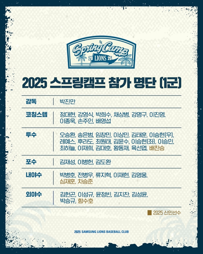 루키 배찬승, 심재훈, 차승준, 함수호까지 4명이 포함됐다. 박진만 감독은 “마무리 캠프에서 신인 선수들을 봤다. 괜찮았다. 일부는 스프링캠프에도 데려갈 생각이다”고 설명한 바 있다.