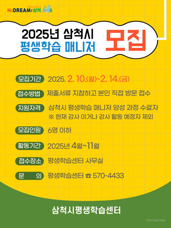 [스포츠서울ㅣ김기원기자]삼척시는 2월 10일(월)부터 14일(금)까지 삼척시 평생학습 매니저 양성 과정 수료자를 대상으로 ‘2025년 삼척시 평생학습 매니저’를 모집한다고 밝혔다.
