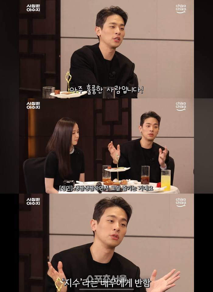 박정민은 23일 유튜브 프로그램 ‘사칭퀸 이수지’에 출연해 지수에 대해 ‘반할 만큼 훌륭한 사람’이라고 치켜세웠다.
