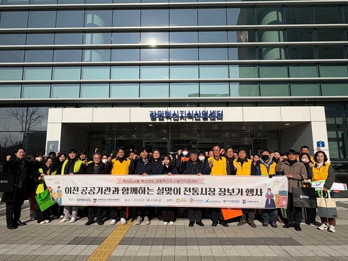 [스포츠서울ㅣ원주=김기원기자]강원혁신도시발전지원센터(이사장 김진태, 이하 ‘센터’)는 설 명절을 앞둔 1월 24일(금), 5개 이전 공공기관과 함께 원주시 소재 전통시장을 방문하여 각자내기 점심식사와 전통시장 장보기 행사를 진행했다.