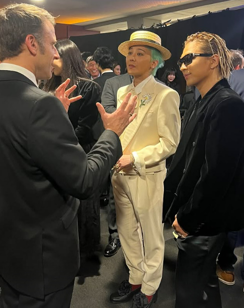 사진 속 태양은 지드래곤과 함께 마크롱 대통령을 만나 대화하는 모습이다.