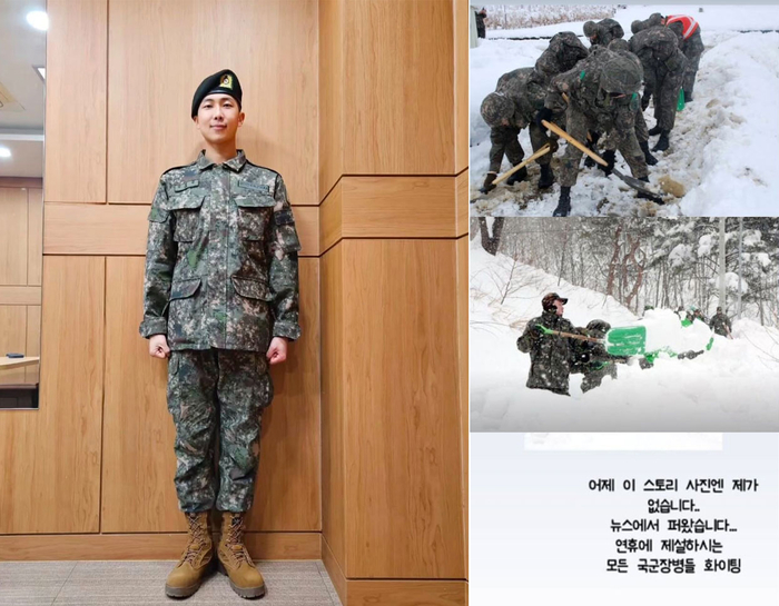 28일 RM은 자신의 SNS에 “사진엔 제가 없다. 뉴스에서 퍼온 사진. 연휴에 제설하시는 모든 국군장병들 파이팅”이라는 글을 게재했다.