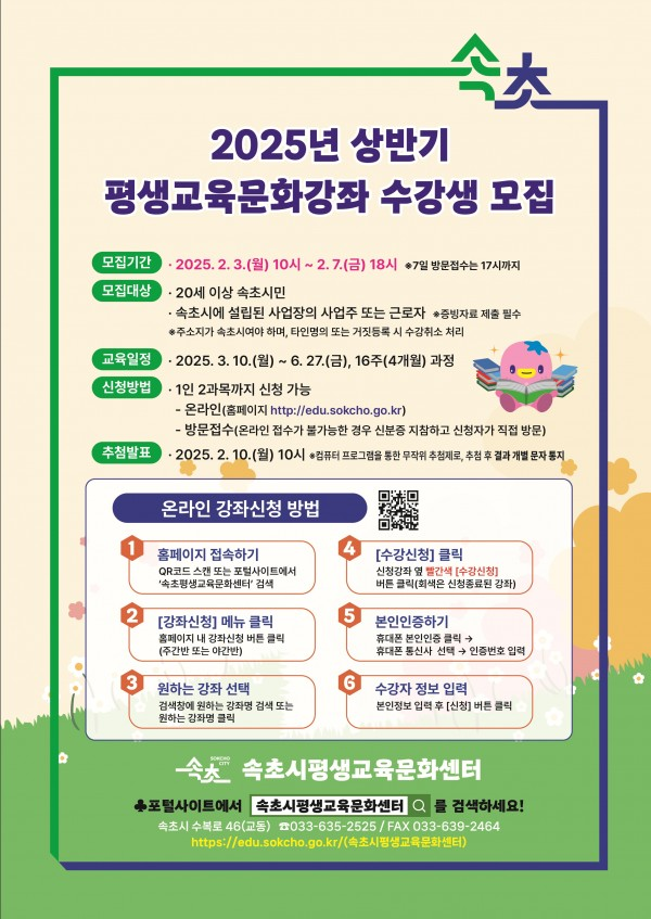 [스포츠서울ㅣ김기원기자]속초시는 오는 2월 3일부터 2월 7일까지 평생학습강좌 상반기 수강생을 모집한다.