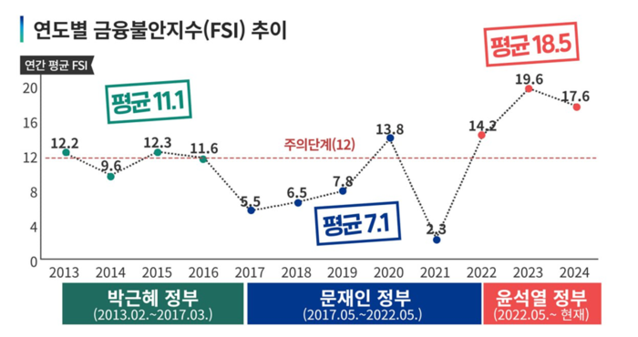 윤석열 정부의 평균 ‘금융불안지수’는 18.5로, 박근혜 정부(평균 지수 11.1) 문재인 정부(평균 지수 7.1)와 비교하면 윤석열 정부 내내 실물 경제와 금융 시장에 얼마나 큰 불안 가능성이 잔존 했는지를 여실히 보여준다.