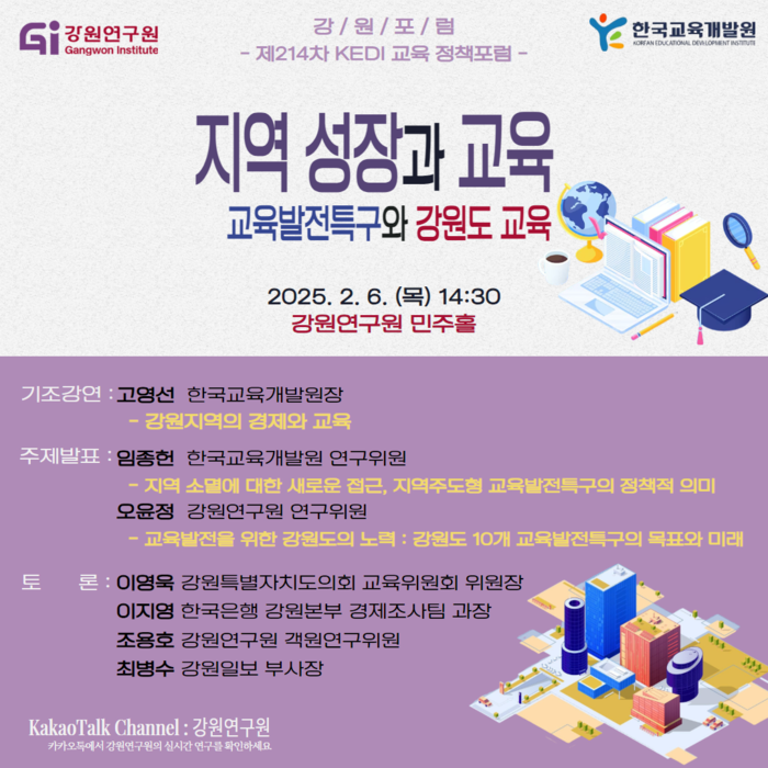 [스포츠서울ㅣ춘천=김기원기자]강원연구원(원장 현진권)은 오는 2월 6일(목) 14시 30분 한국교육개발원(KEDI)와 공동으로 『지역 성장과 교육(부제: 교육발전특구와 강원도 교육)』포럼을 개최한다.
