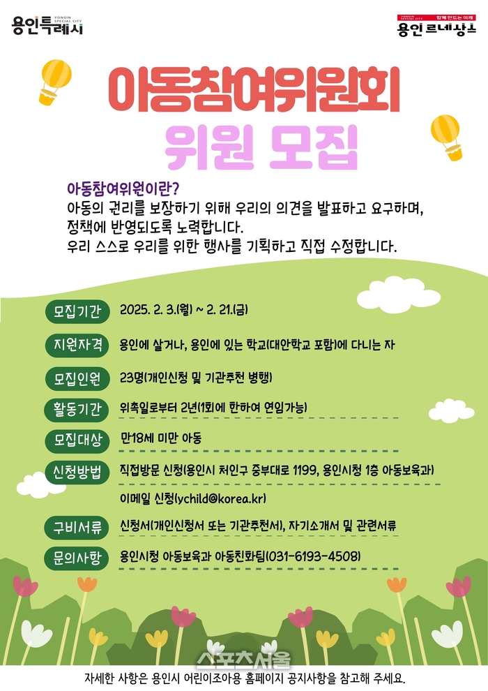 〔스포츠서울│용인=좌승훈기자〕경기 용인시는 오는 21일까지 아동 정책 수립 과정에 직접 참여할 ‘제7기 아동참여위원회’ 위원 23명을 모집한다고 2일 밝혔다.