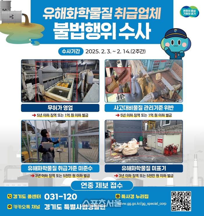 〔스포츠서울│수원=좌승훈기자〕경기도특별사법경찰단은 3일부터 14일까지 도내 유해화학물질 취급업체를 대상으로 불법행위를 집중 수사한다.