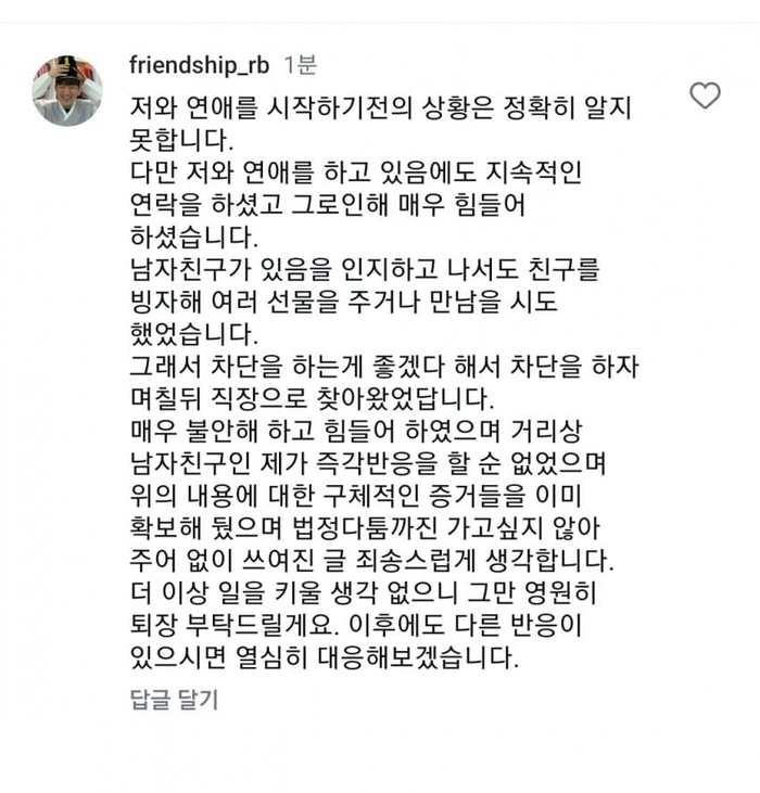 이어 “그래서 차단을 하는 게 좋겠다 해서 차단을 하자 며칠 뒤 직장으로 찾아왔었답니다. 매우 불안해 하고 힘들어 하였으며 거리상 남자친구인 제가 즉각 반응을 할 순 없었으며 위의 내용에 대한 구체적인 증거들을 이미 확보해 뒀으며 법정 다툼까진 가고 싶지 않아 주어 없이 글을 썼습니다다. 죄송스럽게 생각합니다”라고 덧붙였다.
