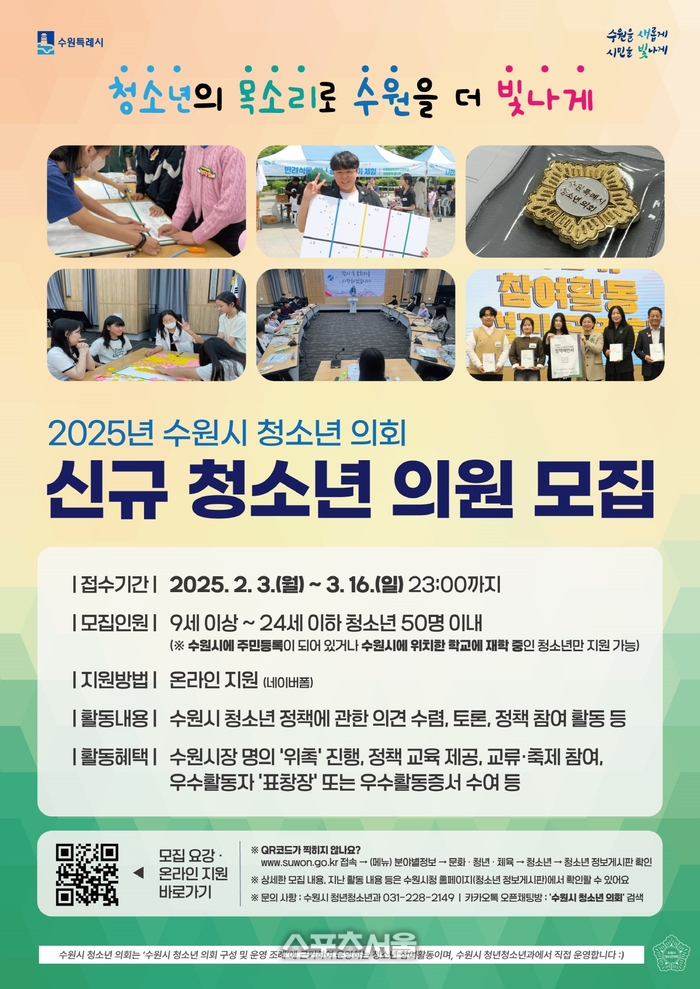 시 홈페이지 ‘시정소식’ 게시판에서 ‘수원시 청소년의회’를 검색해 모집공고문을 볼 수 있다. 다음달 16일 오후 11시까지 온라인(네이버폼)으로 지원해야 한다. 홍보물에 있는 큐알(QR) 코드를 스마트폰으로 스캔하면 지원 웹페이지로 연결된다.