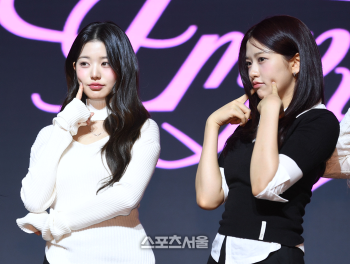 아이브 장원영(왼쪽)과 안유진이 3일 서울 여의도 콘래드호텔에서 열린 미니3집 ‘아이브 엠파시(IVE EMPATHY)’ 발매 기념 기자간담회에서 포즈를 취하고 있다.