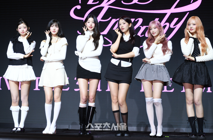 아이브 레이, 가을, 장원영, 안유진, 이서, 리즈(왼쪽부터)가 3일 서울 여의도 콘래드호텔에서 열린 미니3집 ‘아이브 엠파시(IVE EMPATHY)’ 발매 기념 기자간담회에서 포즈를 취하고 있다.