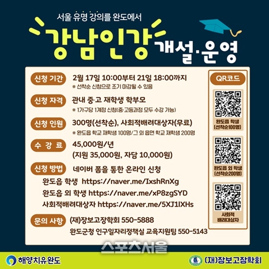[스포츠서울|조광태기자] 전남 완도군과 (재)장보고장학회에서는 지역 중·고교 학생들이 만 원에 서울 강남구 인터넷 강의(이하 ‘강남 인강’)를 무제한 수강할 수 있도록 수강료를 지원한다.