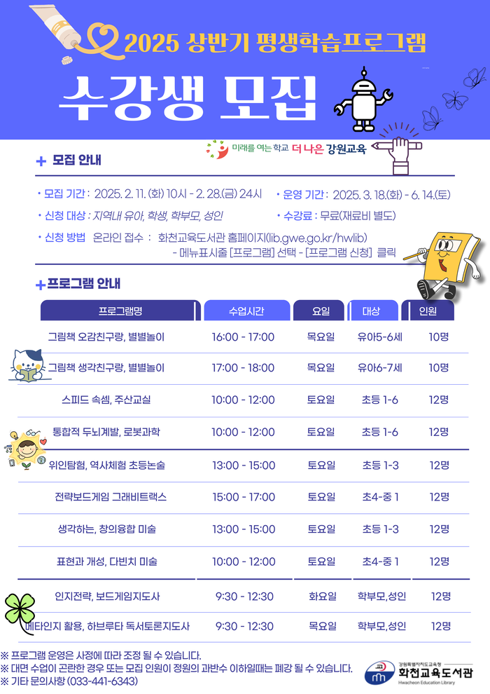 [스포츠서울ㅣ김기원기자]강원특별자치도교육청화천교육도서관(관장 류은선)은 화천군민 대상으로 3월 18일(화)부터 6월 14일(토)까지 2025년 상반기 평생학습프로그램을 운영한다.