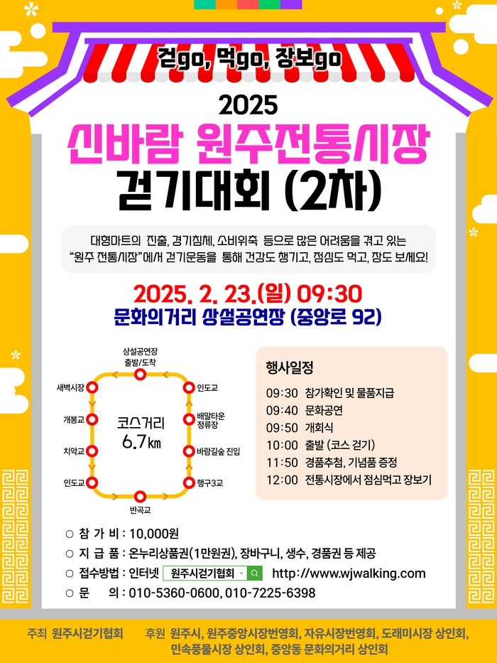 [스포츠서울ㅣ원주=김기원기자]지난 1월 26일 원주시민 300명이 참가하며 뜨거운 관심 속 1차 대회를 성황리에 마친 ‘2025 신바람 원주전통시장 걷기대회’가 오는 23일 2차 행사를 개최한다.