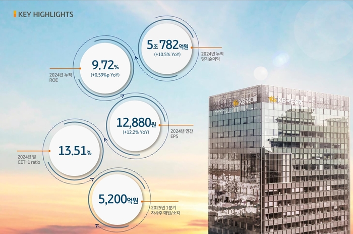 핵심 계열사인 국민은행은 지난해 당기순이익 3조2518억원으로 2023년보다 0.3% 감소했다. 1분기 ELS 손실 관련 대규모 충당부채 전입 영향이 연간 실적에도 영향을 미친 것으로 풀이된다. 연간 은행 순이자마진(NIM)은 1.78%로 전년 대비 5bp(베이시스포인트) 하락했다. 그러나 지난해 은행의 순이자이익은 10조22239억원으로 전년보다 3.6% 증가했다.
