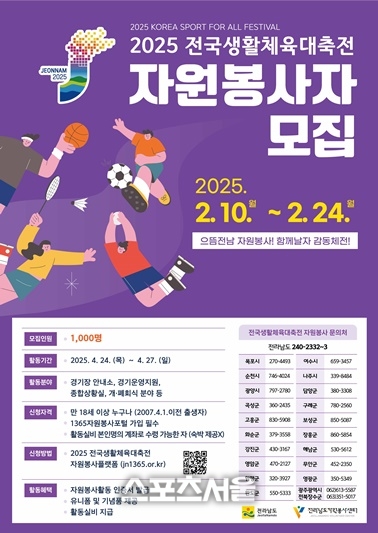 [스포츠서울|조광태기자] 전라남도자원봉사센터(이사장 김형석)는 오는 4월 24일부터 27일까지 개최되는 ‘2025 전국생활체육대축전’의 성공 개최를 위해 약 1천여 자원봉사자를 모집한다고 밝혔다.