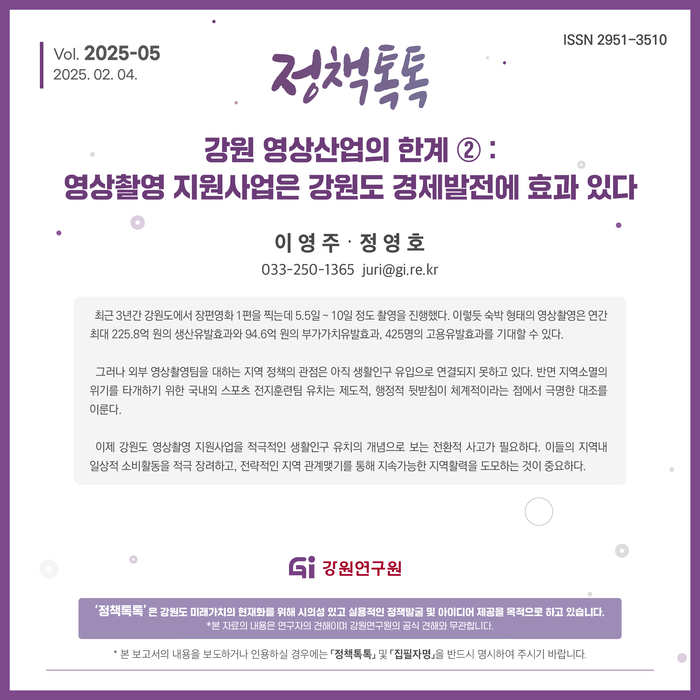 [스포츠서울ㅣ춘천=김기원기자]강원연구원(원장 현진권)은 “강원 영상산업의 한계 ② : 영상촬영 지원사업은 강원도 경제발전에 효과 있다”라는 제목으로 2025년 제5호 정책톡톡을 발간했다.