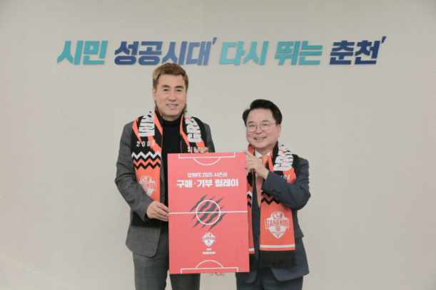[스포츠서울ㅣ춘천=김기원기자]육동한 춘천시장이 6일 김병지 강원특별자치도민프로축구단(이하 강원FC) 대표이사와 함께 강원FC 시즌권 구매 및 기부 릴레이에 동참했다.