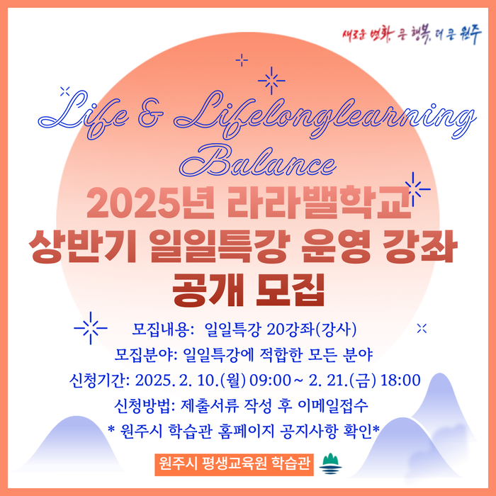 [스포츠서울ㅣ원주=김기원기자]원주시 평생교육원 학습관은 ‘2025년 라라밸학교 상반기 일일특강’ 운영 강좌를 모집한다.
