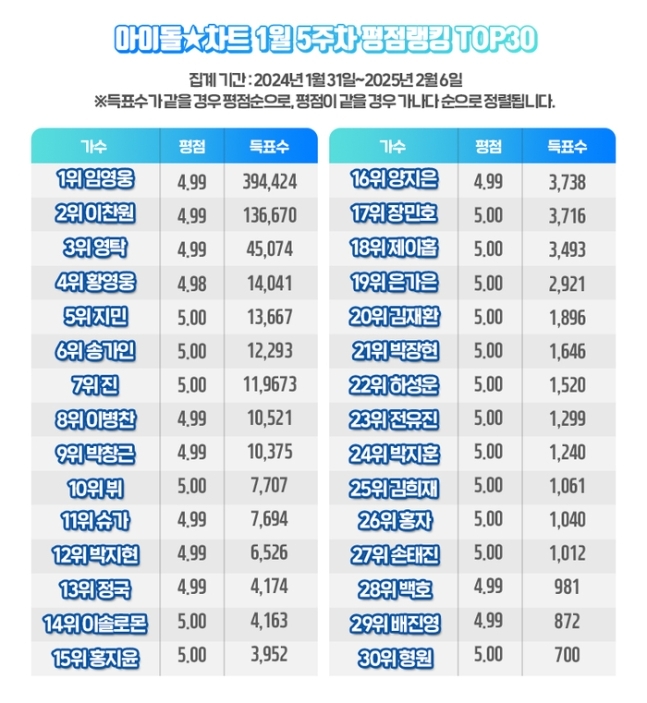 또한 임영웅은 아이돌차트 평점랭킹에서도 202주 연속 1위를 유지했다. 1월 5주차 아이돌차트 평점랭킹에서 39만4424표를 얻어 1위를 차지했다. 202주 연속 1위의 대기록이다.