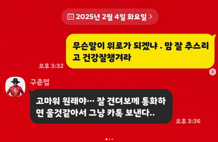 공개된 사진에는 강원래와 구준엽이 나눈 메시지가 담겨있다. 강원래는 구준엽을 향해 “무슨 말이 위로가 되겠냐. 마음 잘 추스르고 건강 잘 챙겨라”라고 응원의 말을 전했다.