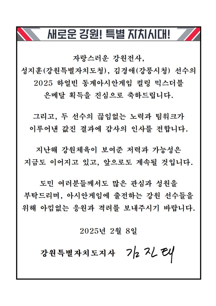 [스포츠서울ㅣ춘천=김기원기자] 김진태 강원특별자치도지사가 2월 8일 2025 하얼빈 동계아시안게임 ‘컬링 믹스더블’에서 은메달을 획득한 자랑스러운 강원전사 성지훈(강원특별자치도청), 김경애(강릉시청) 선수에게 축전을 보내 승리를 축하했다.