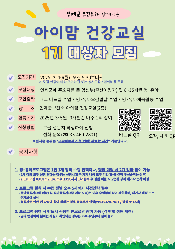 [스포츠서울ㅣ김기원기자]인제군보건소가 아이맘 건강교실 참여자를 모집한다.