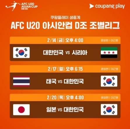 [스포츠서울 | 표권향 기자] 쿠팡플레이가 이달 12일부터 3월1일까지 중국 심천에서 열리는 ‘2025 AFC(아시아축구연맹) U20 아시안컵(이하 아시안컵)’을 생중계한다. 대한민국 대표팀의 경기는 ▲2월14일 오후 4시 시리아전 ▲17일 오후 6시 15분 태국전 ▲20일 오후 4시 일본전을 비롯해, 대한민국과 함께 D조에 속한 국가들의 조별 예선 전 경기를 전한다.