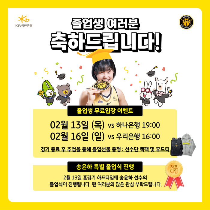 [스포츠서울 | 김동영 기자] 청주 KB국민은행 스타즈가 졸업의 계절 2월을 맞아 오는 13일과 16일 홈경기에서 ‘졸업생 무료입장’ 이벤트를 실시한다.
