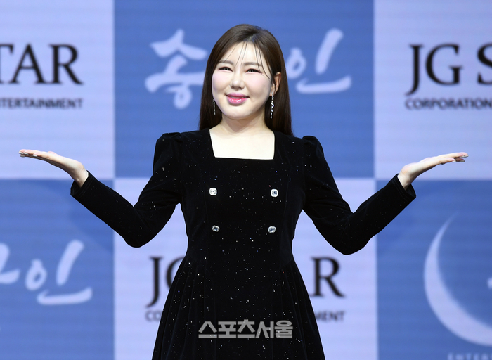 가수 송가인이 11일 서울 강서구 스카이아트홀에서 진행된 정규 4집 ‘가인;달’ 발매 기념 쇼케이스에서 취재진을 향해 포즈를 취하고 있다.