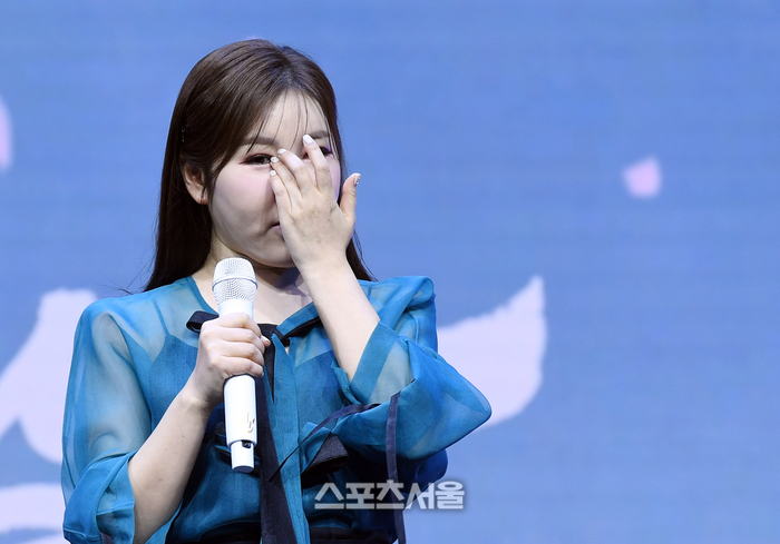 가수 송가인이 11일 서울 강서구 스카이아트홀에서 진행된 정규 4집 ‘가인;달’ 발매 기념 쇼케이스에서 타이틀곡 ‘아사달’을 열창한 뒤 눈물을 훔치고 있다.
