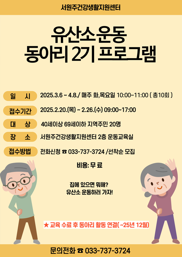 [스포츠서울ㅣ원주=김기원기자]서원주건강생활지원센터는 장소에 구애받지 않는 유산소 운동을 통해 지역 주민의 운동에 대한 흥미와 접근성을 높일 수 있는 ‘유산소 운동 동아리 2기’ 프로그램 참여자를 모집한다.