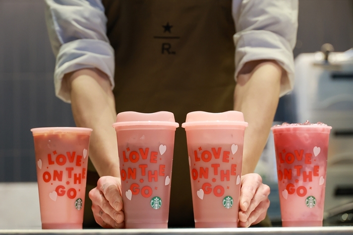 새로 출시한 음료 두 종이 폭발적인 인기를 얻자 스타벅스는 ‘밸런타인데이’ 마케팅을 본격적으로 전개했다. 13일부터 일주일 동안 매장 파트너를 통해 이달의 프로모션 음료 두 종을 포함한 이벤트 음료를 주문하면, 선착순으로 음료를 리유저블 컵에 담아준다.