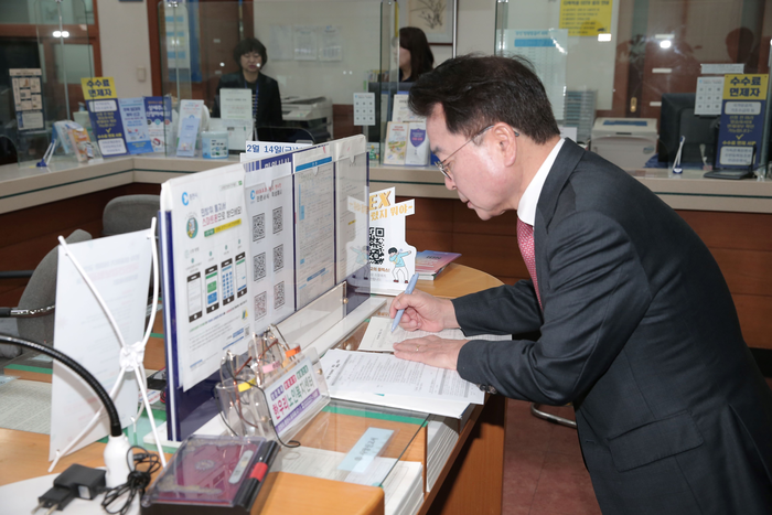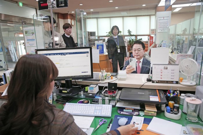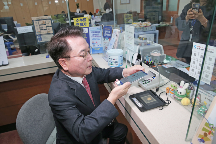 육동한 춘천시장이 모바일 주민등록증 발급 첫날인 14일 직접 효자1동 행정복지센터를 방문해 모바일 주민등록증을 발급하고 현장을 점검했다.