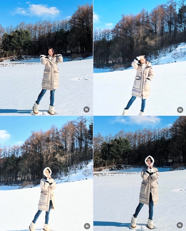 17일 이민정은 자신의 인스타그램에 “겨울의 끝을 잡고... 설원 촬영...”이라는 글과 함께 흰색 패딩 롱점퍼와 부츠를 신고 있는 사진을 게재했다.