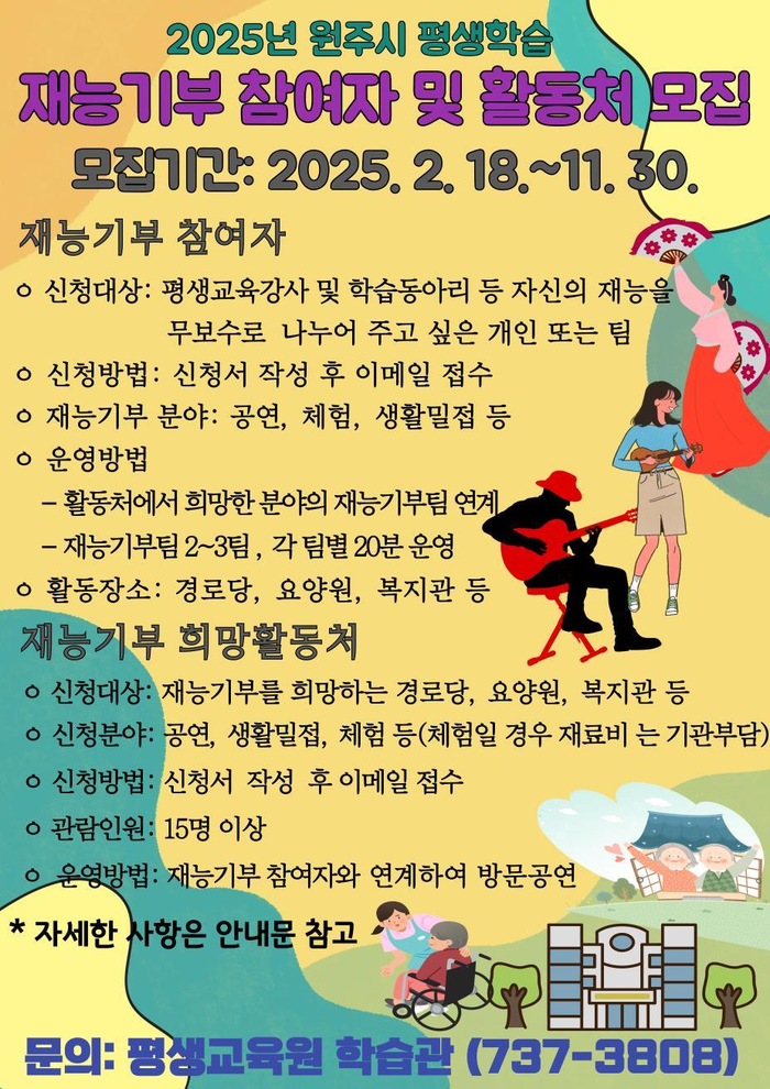 [스포츠서울ㅣ원주=김기원기자]평생교육원 학습관은 2월 18일부터 11월 30일까지 2025년 원주시 평생학습 재능기부 참여자 및 활동처를 수시 모집한다.