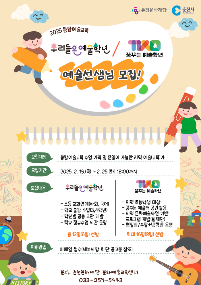 [스포츠서울ㅣ춘천=김기원기자]춘천문화재단(이사장 박종훈)은 오는 2월 25일(화)까지 2025 통합예술교육 「우리들은/꿈꾸는 예술학년」 사업에 참여할 예술선생님을 모집한다고 밝혔다.
