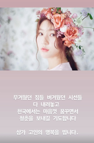 배우 서유정은 SNS에 “이 땅에서 별이 되기까지 힘들었을, 하늘에선 영원히 떨어지지 않는 별로 행복하게 지내라, 견디고 사느라 고생 많았다”고 추모했다.